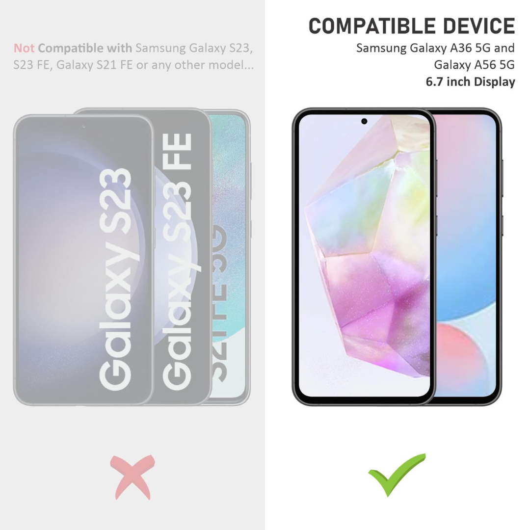 Compatible Device: This Tempered Glass is Perfectly compatible with Samsung Galaxy A36 and Samsung Galaxy A56 (6.7 Inch). Easy Installation: This is a edge to edge screen protector, Bubble free adhesive and easy to install. You can follow installation guidelines which printed on Installation guide. Box Includes: Tempered Glass, Wet wipe, Dry Wipes, Dust absorber sticker with installation guidelines.